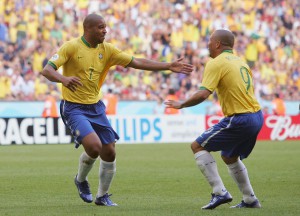 MUNICH, GERMANY – JUNE 18: Adriano of Brazil is congratulated by team mate Ronaldo after scoring the first goal of the game during the FIFA World Cup Germany 2006 Group F match between Brazil and Australia at the Stadium Munich on June 18, 2006 in Munich, Germany. (Photo by Robert Cianflone/Getty Images)