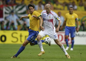 FRANKFURT, GERMANY – JULY 01: Kaka of Brazil and Zinedine Zidane of France compete for the ball during the FIFA World Cup Germany 2006 Quarter-final match between Brazil and France at the Stadium Frankfurt on July 1, 2006 in Frankfurt, Germany. (Photo by Michael Steele/Getty Images)