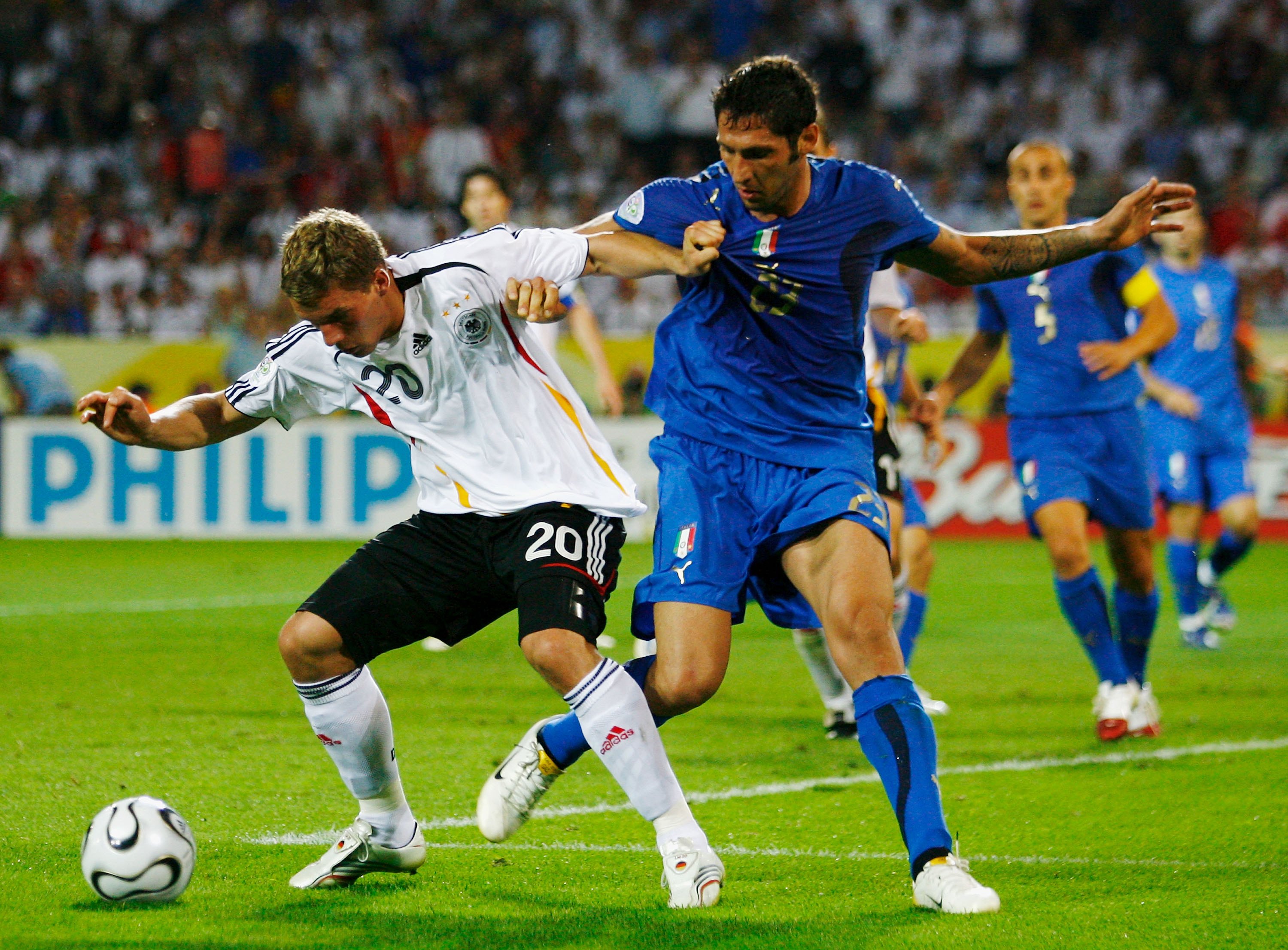 DORTMUND, GERMANY – JULY 04: Lukas Podolski of Germany tussles for posession with Marco Materazzi of Italy during the FIFA World Cup Germany 2006 Semi-final match between Germany and Italy played at the Stadium Dortmund on July 04, 2006 in Dortmund, Germany. (Photo by Shaun Botterill/Getty Images)