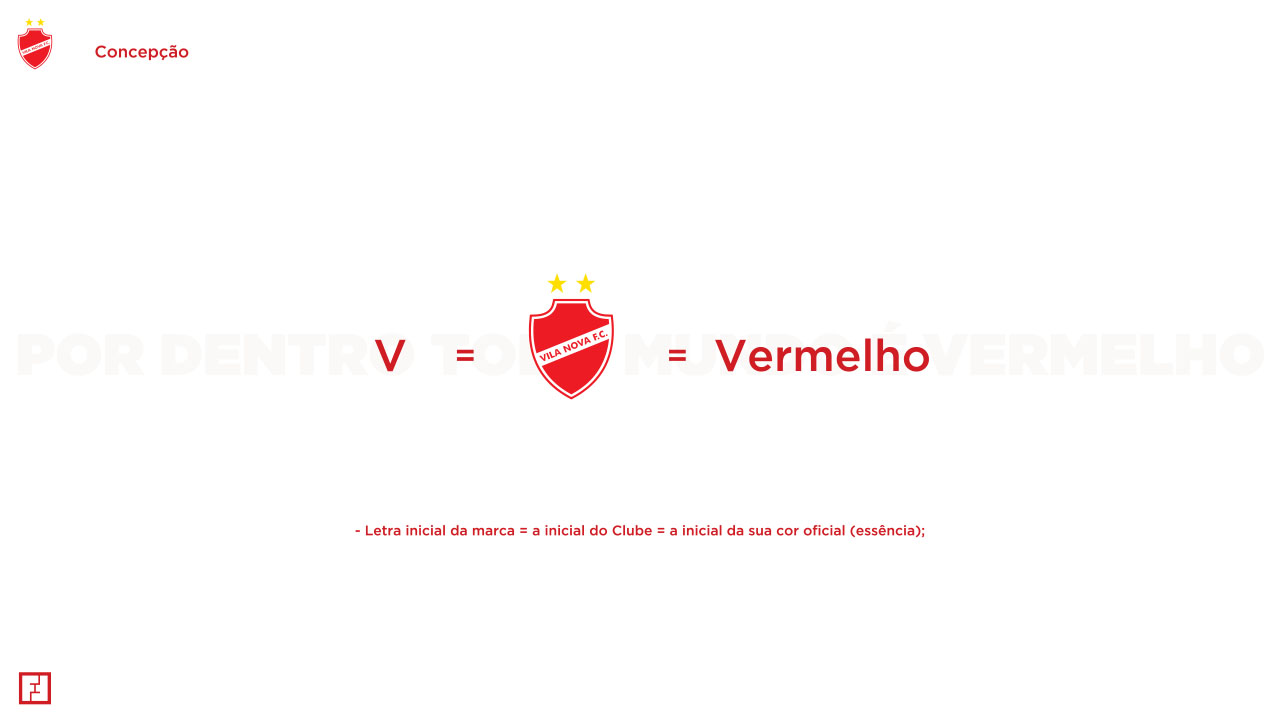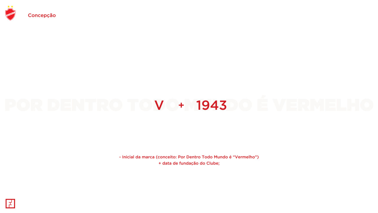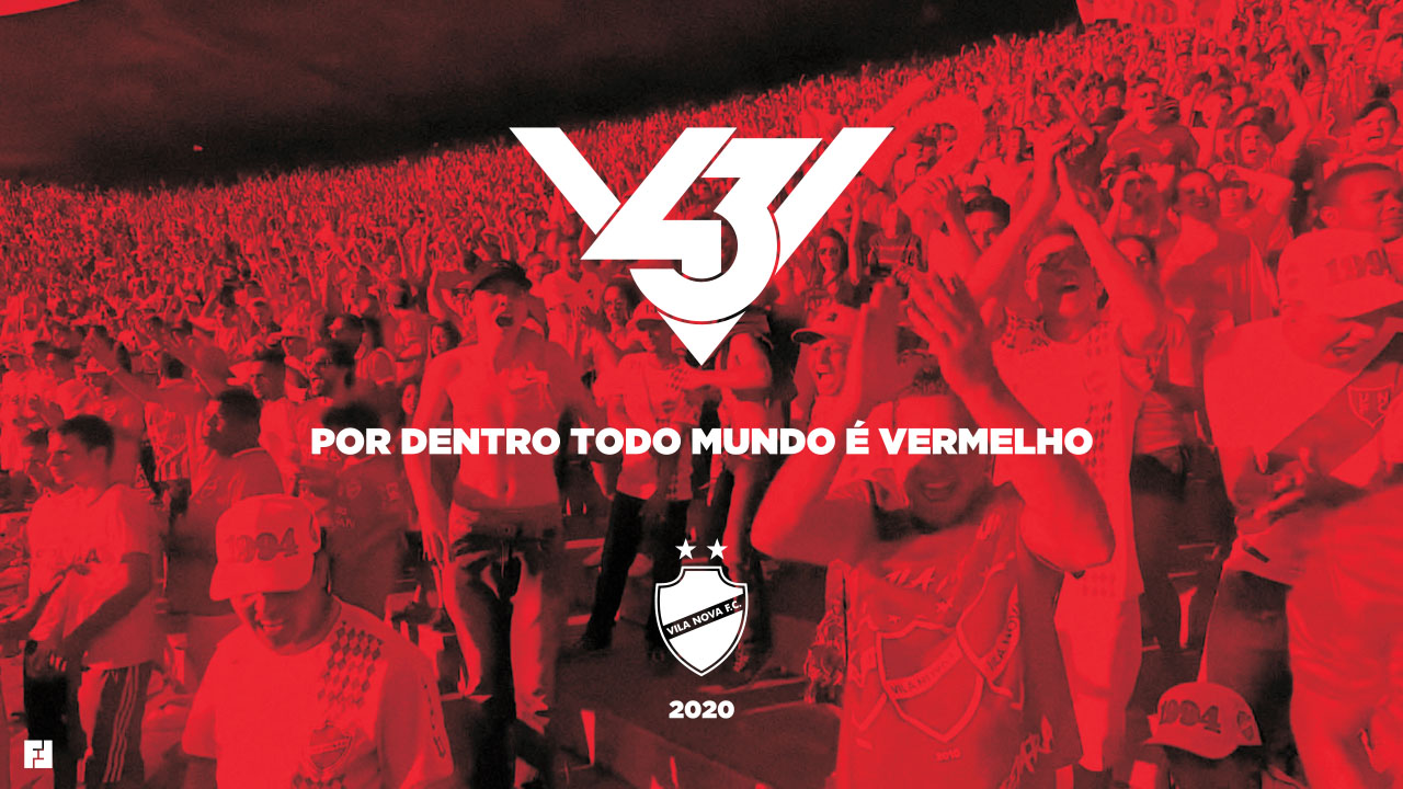O ponto de partida para a criação da marca V43 foi a comunicação que o Vila Nova utilizava com o seu torcedor, desde o início de 2019: a hashtag #SerVermelho, a cor oficial do clube. A partir desse posicionamento apresentei o nome da marca acompanhado do slogan de lançamento: “V43 – Por Dentro Todo Mundo É Vermelho”. Algo inquestionável.