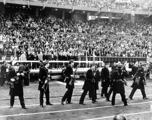 ARCHIV – Bewaffnete Sicherheitskräfte marschieren auf vor dem Podest mit dem argentinischen Junta-Chef General Videla vor der Pokalübergabe am 25.06.1978 bei der Fußball-WM im River Plate-Stadion in Buenos Aires, Argentinien. Die Nationalspieler sollen Menschenrechtsverletzungen bei der Fußball-EM in der Ukraine offen thematisieren, fordert Bayern-Präsident Hoeneß. Bei der Fußball-WM 1978 in Argentinien, wo eine brutale Militär-Junta herrschte, wollte man sich lieber auf Fußball konzentrieren. Foto: dpa (zu dpa-KORR: «Es war auch mal anders: Die WM 1978 in Argentinien» vom 02.05.2012) +++(c) dpa – Bildfunk+++