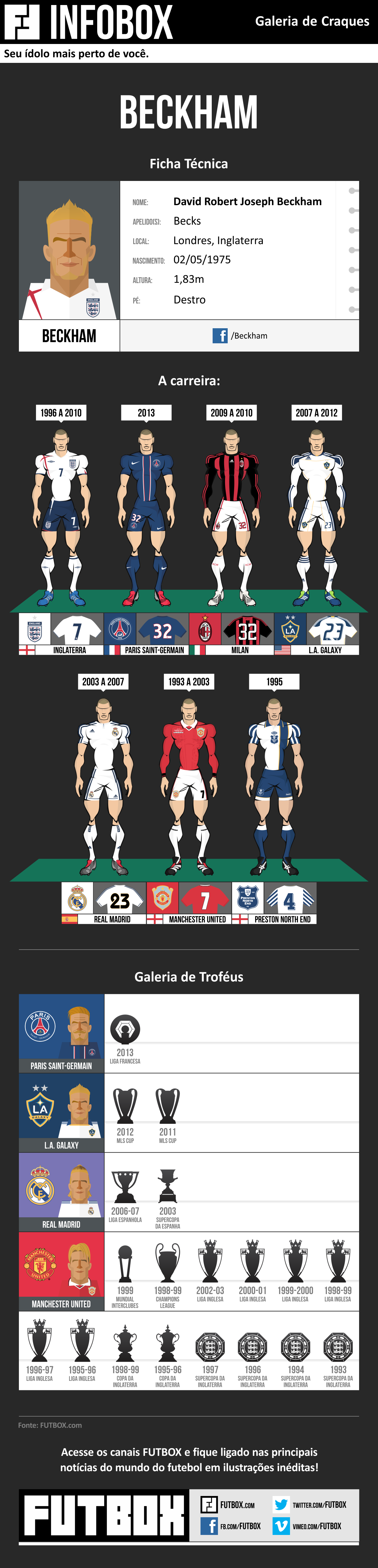 David Beckham nasceu em 2 de maio de 1975 em Leytonstone, Londres. No entanto, o craque despontou a mais de 300km dali. Foi em Manchester, no Manchester United, que o jogador conquistou a popularidade e se tornou uma celebridade.